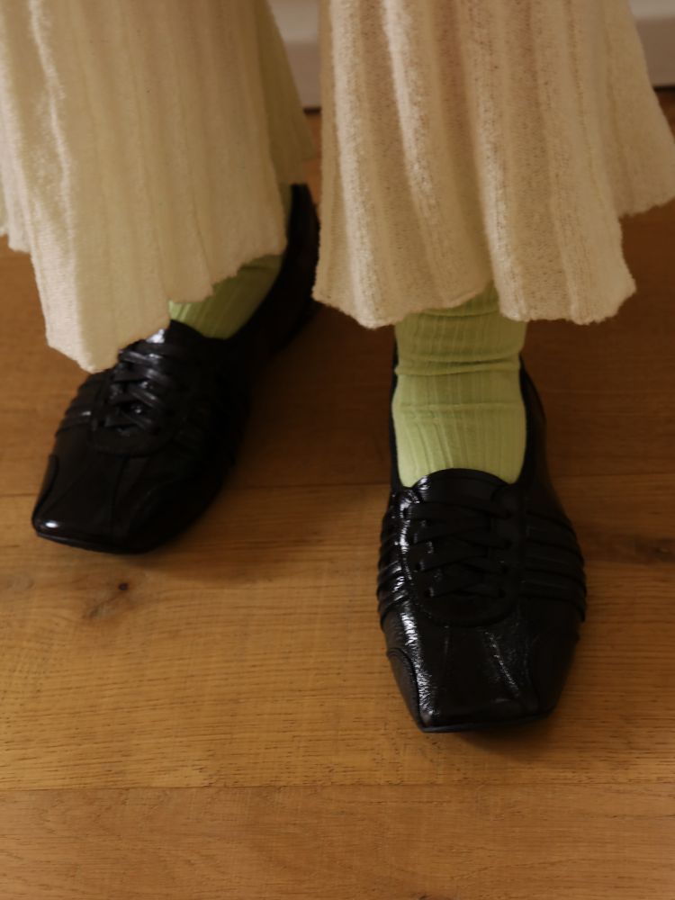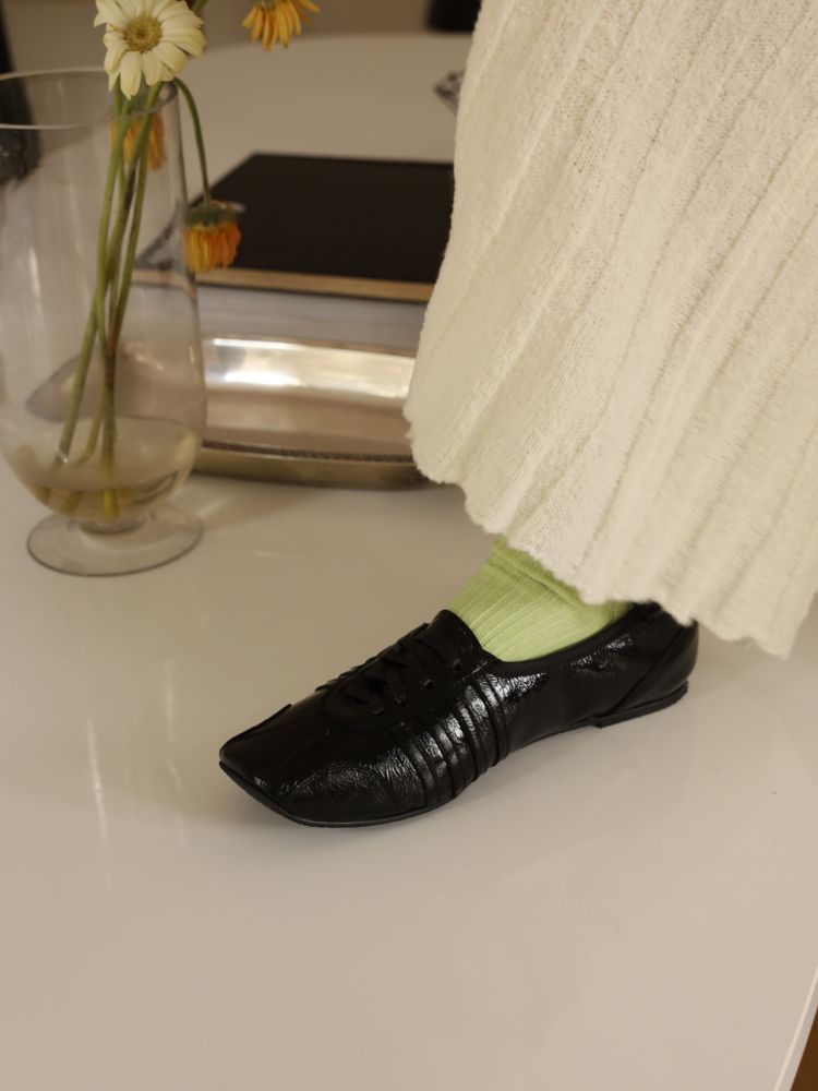 ‘The flat shoe blends vintage ballet shoe aesthetics with details from trekking, soccer, and boxing shoes. Made from goat skin with a glossy finish, it features a unique texture highlighted by prominent cracks.’