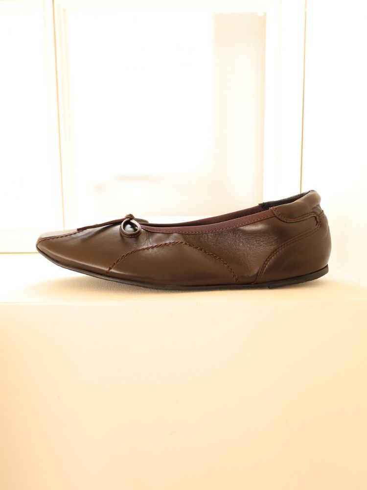 ‘‘Pebble is a classic flat shoe featuring a pebble-shaped color block at the toe. With a refined silhouette between square and round, it is finished with delicate details like ribbon ties and visible stitching. Stretch bands, cushioned heel and insole bring the comfort of sneakers into this elegant form.’’